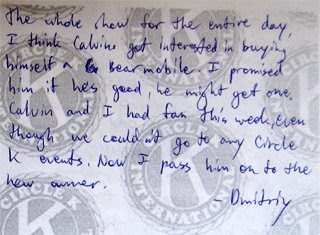 On Sunday, Calvin and I spent quality time with my brother at the SF Auto Show. After walking around the whole show for the entire day, I think Calvin got interested in buying himself a bear mobile. I promised him if he's good, he might get one. Calvin and I had fun this week, even though we couldn't go to any Circle K events. Now I pass him onto the new owner.